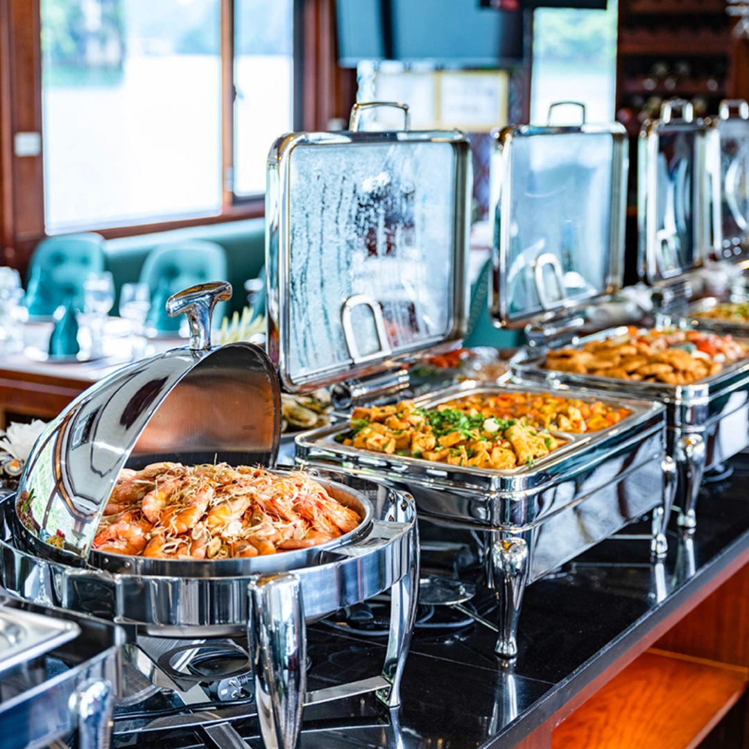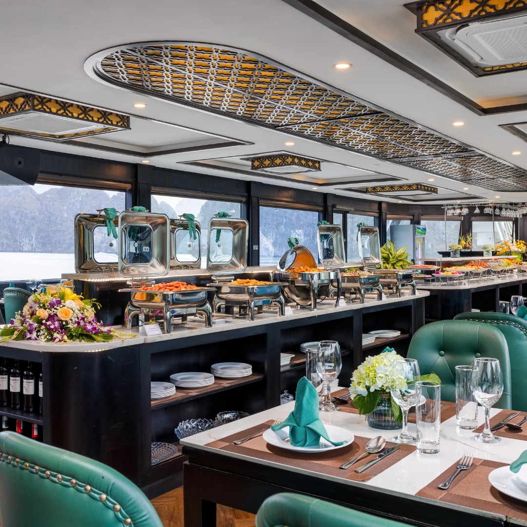 12h30: lunch on board, enjoy buffet lunch with vietnamese traditional food while cruising though thousands of limestone islands such as: dog rock, insence bunner and especially fighting cock – a symbol of ha long bay.