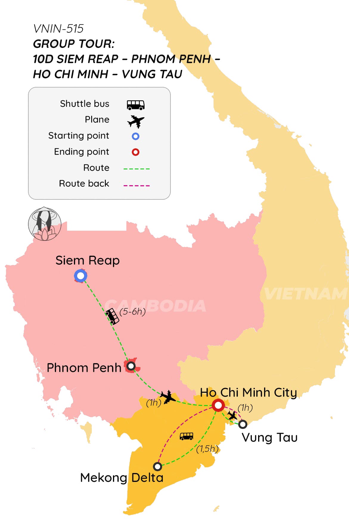 Siem Reap (2 đêm), Phnom Penh (2 đêm), Thành phố Hồ Chí Minh (3 đêm), Vũng Tàu (2 đêm)