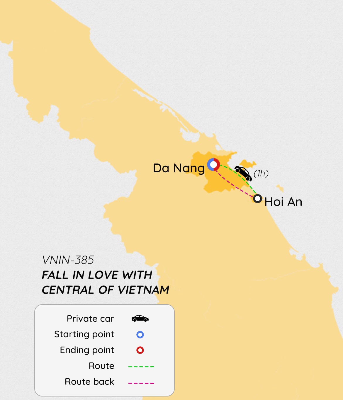 Đúng như tên gọi, tour Fall in Love With Central of Vietnam này sẽ khiến bạn mê mẩn trước vẻ đẹp của Đà Nẵng và Hội An – những thành phố “đáng sống” nhất Việt Nam. Bạn sẽ có cơ hội khám phá Ngũ Hành Sơn – một nhóm năm ngọn núi đá cẩm thạch và đá vôi, được đặt tên theo năm yếu tố của triết lý phương Đông cổ đại hoặc khám phá những con phố lát đá cuội hẹp của phố cảng cổ và ghé thăm các di tích lịch sử bao gồm một ngôi nhà truyền thống ở Phố cổ Hội An. Để biết thêm các lựa chọn, vui lòng xem các gói tour du lịch Việt Nam của chúng tôi.
