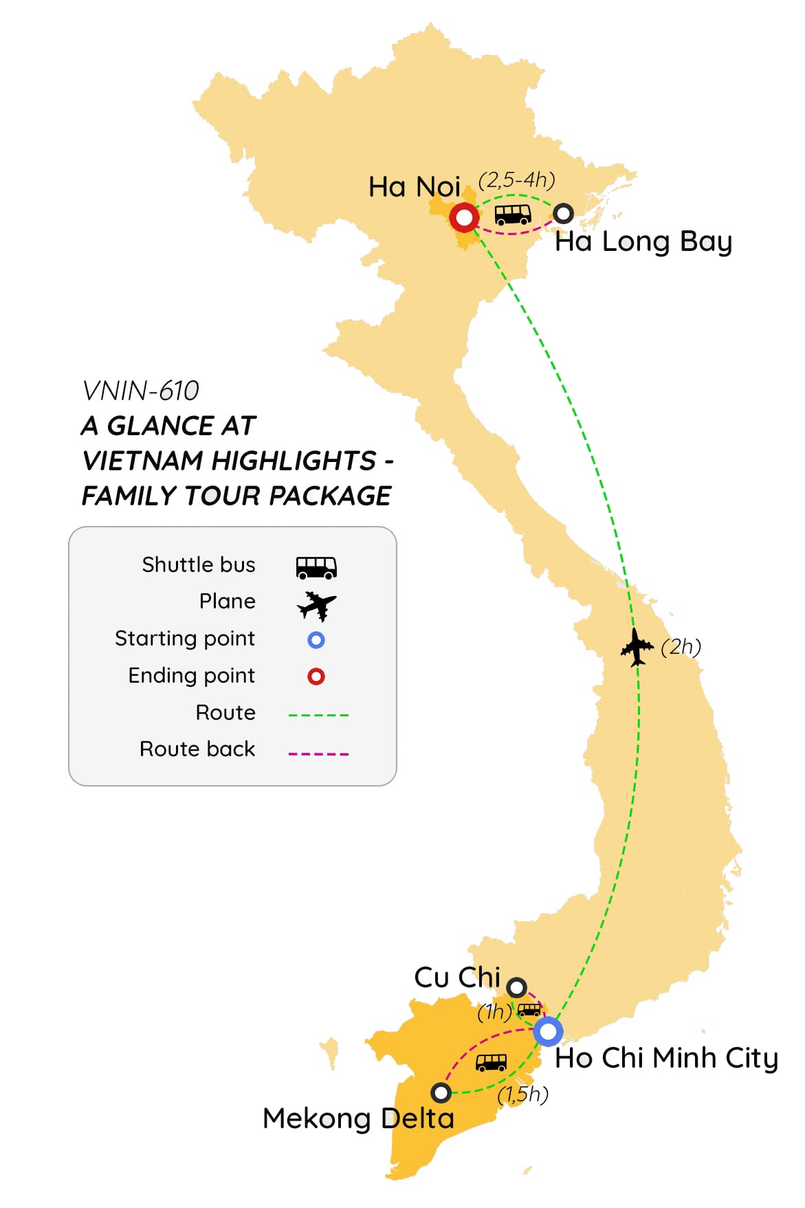 Thành phố Hồ Chí Minh (3 đêm), Hà Nội (2 đêm), Vịnh Hạ Long (1 đêm)