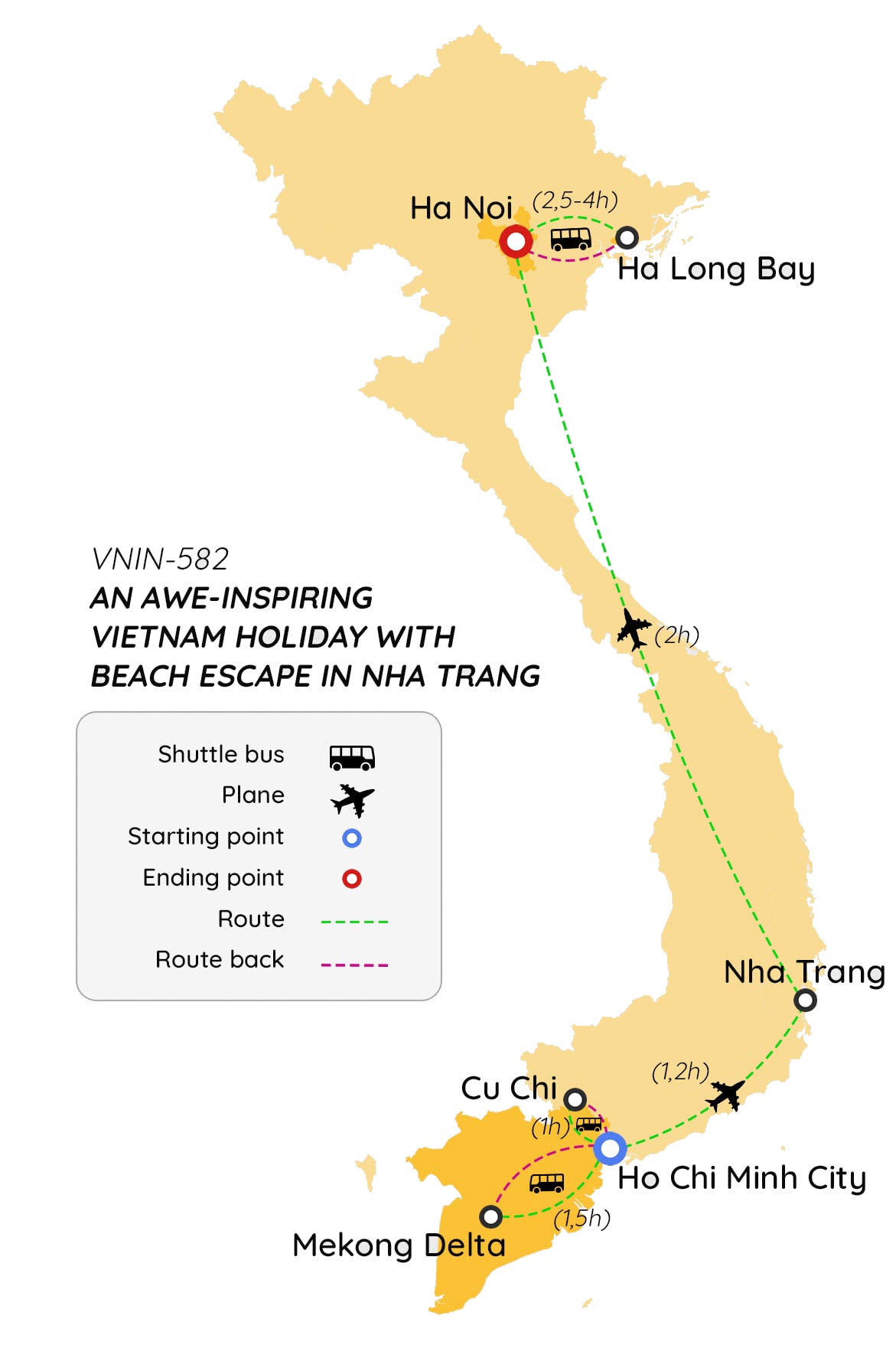 Thành phố Hồ Chí Minh (3 đêm), Nha Trang (2 đêm), Hà Nội (2 đêm), Vịnh Hạ Long (1 đêm)