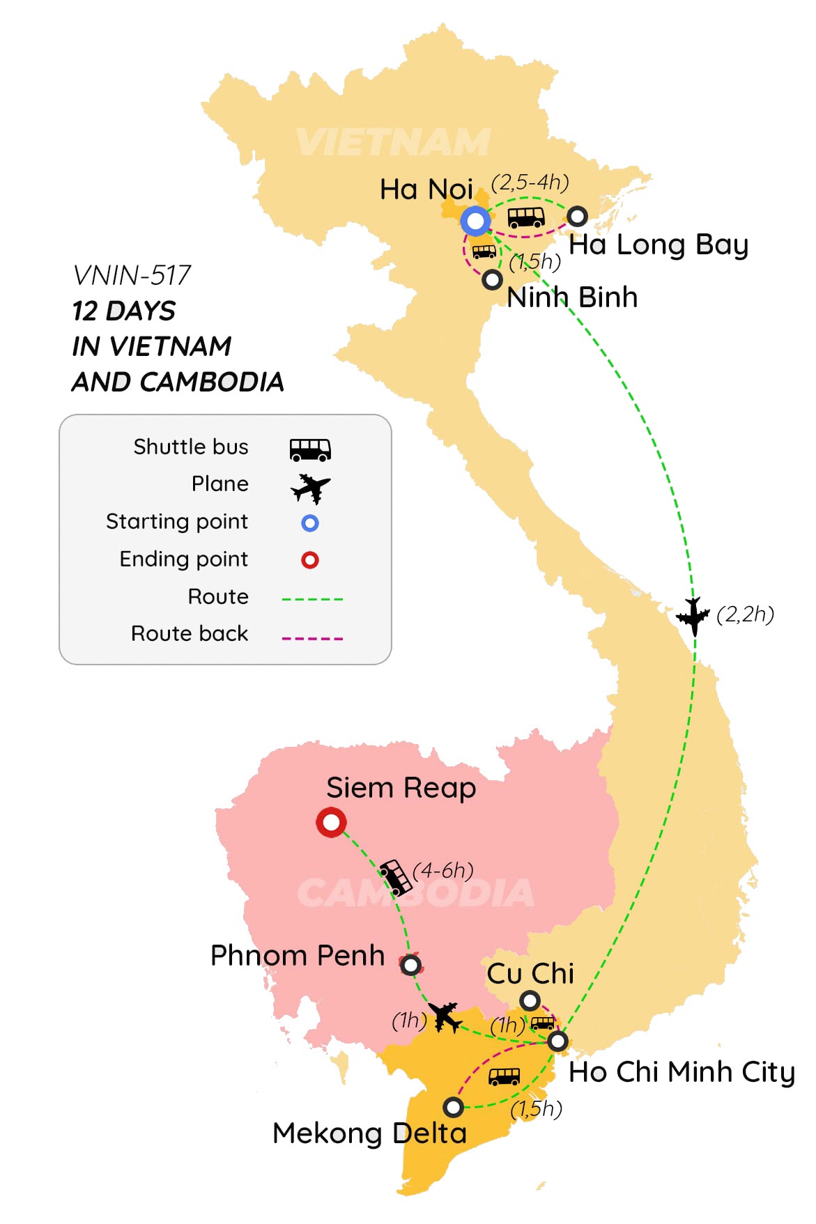 Hà Nội (4 đêm), Thành phố Hồ Chí Minh (3 đêm), Phnom Penh (2 đêm), Siem Reap (2 đêm)