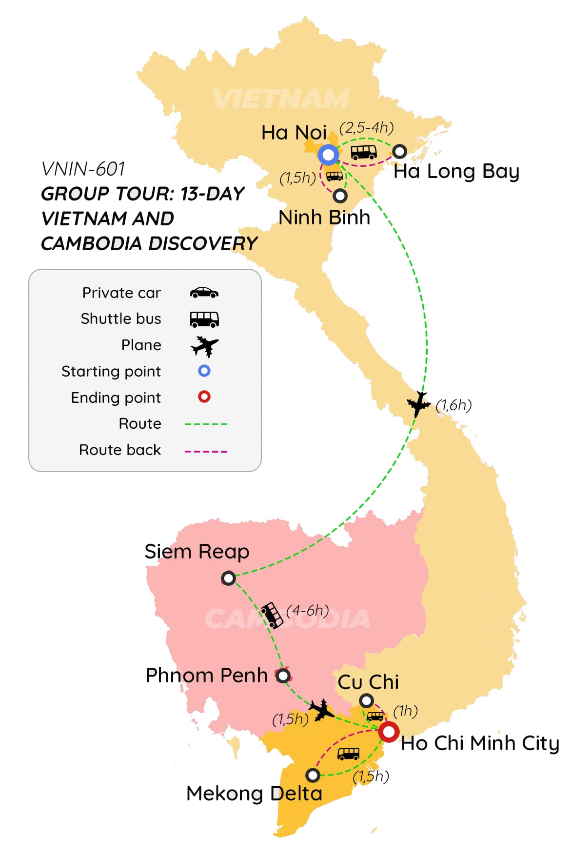 Hà Nội (4 đêm), Vịnh Hạ Long (1 đêm), Siem Reap (2 đêm), Phnom Penh (2 đêm), Thành phố Hồ Chí Minh (3 đêm)