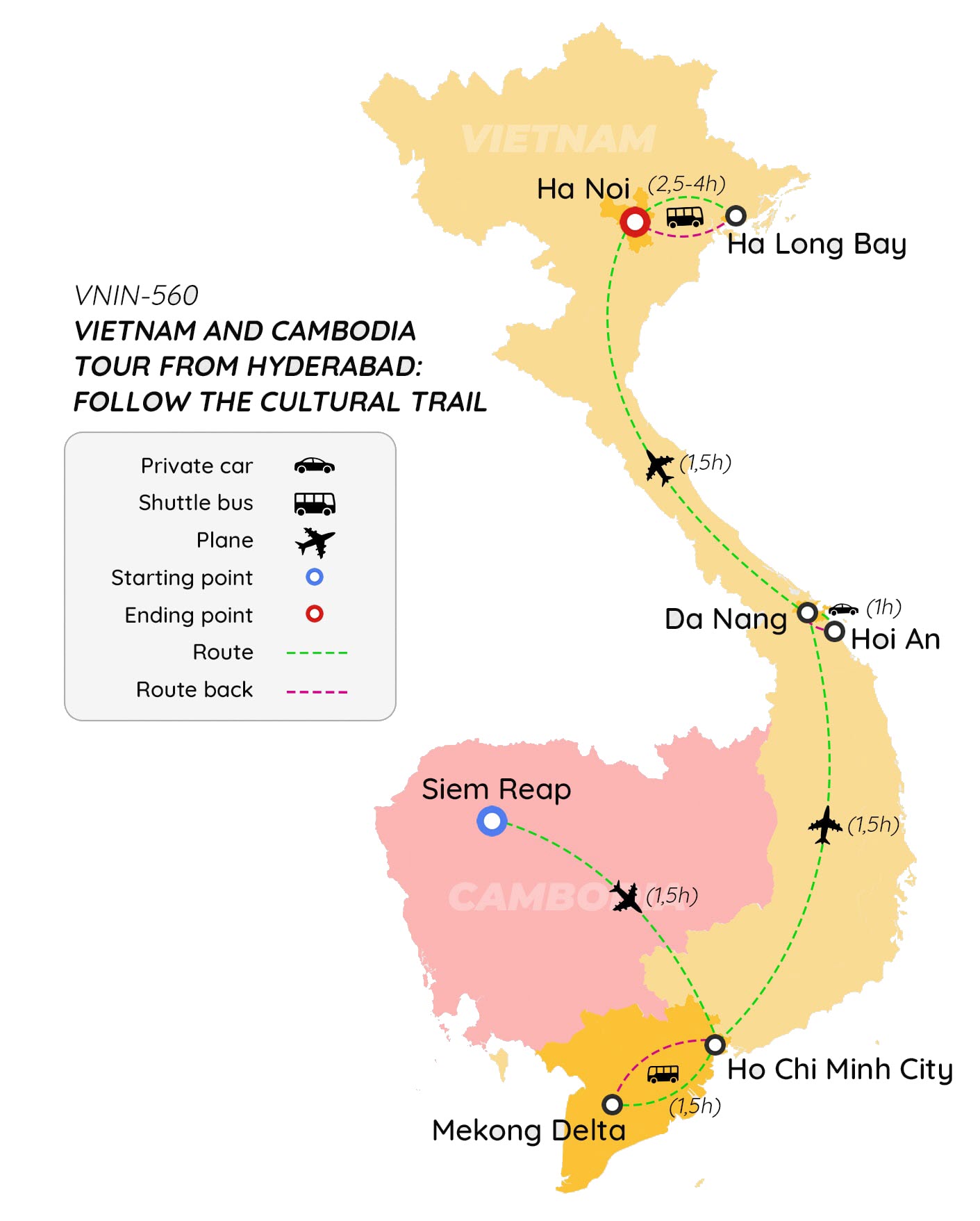 Siem Reap (2 đêm), Hồ Chí Minh (2 đêm), Hội An (2 đêm), Hà Nội (3 đêm) Vịnh Hạ Long (1 đêm)