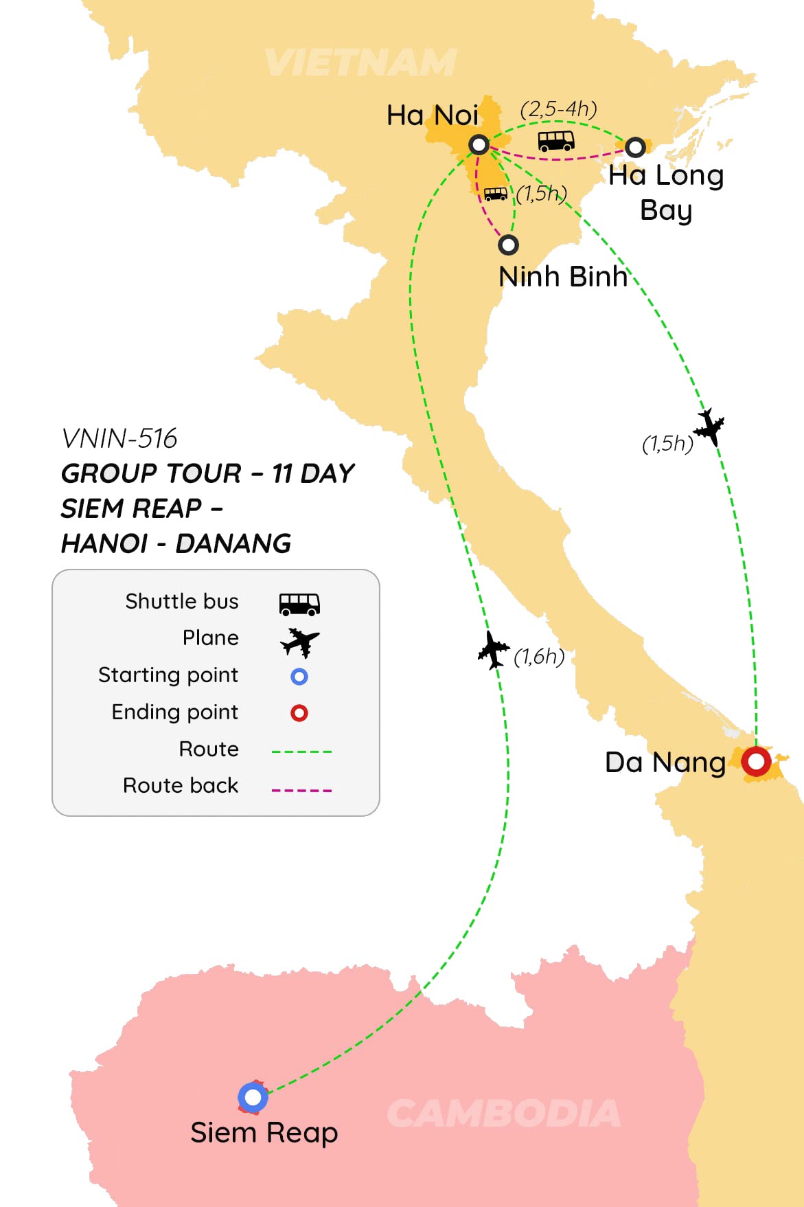 Siem Reap (2 đêm), Hà Nội (4 đêm), Hạ Long (1 đêm), Đà Nẵng (3 đêm)